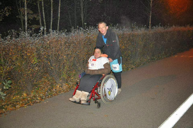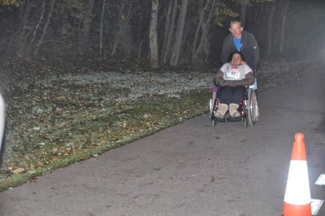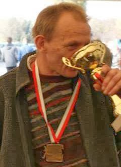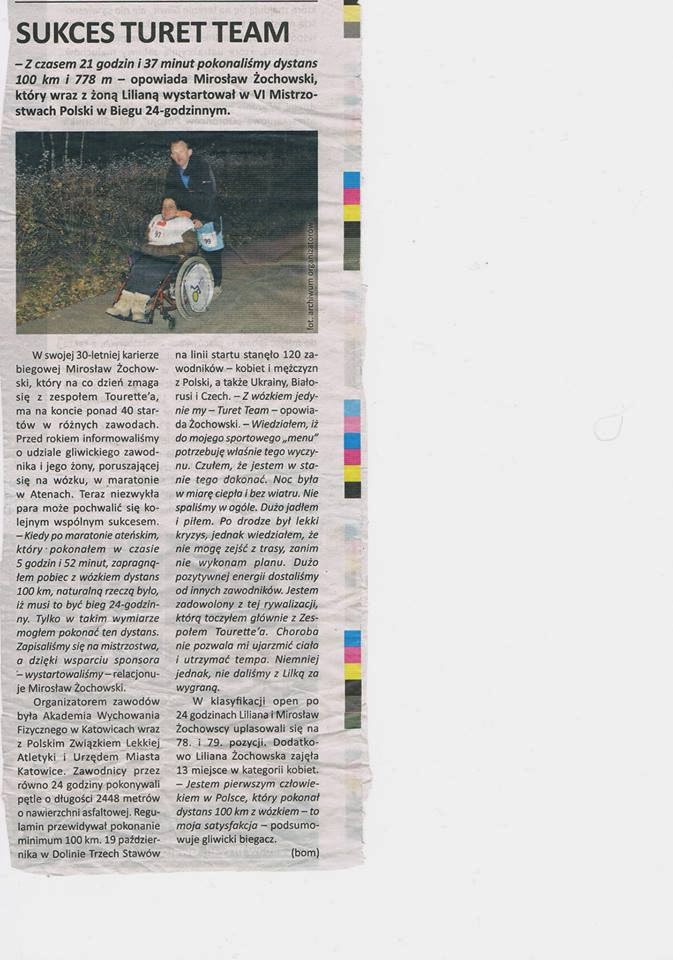 Kiedy po maratonie ATEŃSKIM z czasem 5godz 52 min , zapragnąłem pobiec z wózkiem dystans 100km, naturalną rzeczą było iż musi to być bieg 24 godzinny. Tylko w takim wymiarze mogę pokonać ten zamierzony dystans.Zapisaliśmy się na zawody. Dzięki sponsorowi fundacji Lepszy Świat z Gliwic , wystartowaliśmy. 19 pazdzernika w Dolinie Trzech Stawów stanęło 120 zawodników. Z wózkiem jedynie my. Turet Team. Wiedziałem iż do mego sportowego menu, potrzebuję właśnie tego wyczynu. Czułem że jestem w stanie tego dokonać. Egzaltacja i pewna metafizyka jaka towarzyszyła mi w trakcie biegu to nieodzowna aplikacja tego sportowego wyczynu. Biegłem zaledwie do 30 kilometra. Potem stwierdziłem że niema powody się zarzynać. Czasu wystarczy a chodzi tylko o dystans 100 km . Fakt iż biegłem bez żadnego przygotowania , niechaj nie będzie podkręcaniem mego heroizmu. Taki jestem .Na 30 letnią karierę mego biegania,, zalicza się około 40 kilka startów w oficjalnych zawodach. Drugi fakt to moje małżeństwo. Gdyby nie ono , dawno przestał bym biegać. Żona daje twarz a ja nogi i intelekt. Zawsze śmieje się moja żona. Lila dzielnie zniosła te 24 godziny biegu. Noc okazała się być w miarę ciepła i bez wietrzna. Nie spaliśmy w ogóle. Dużo jadłem i piłem. Rosół , cocacola , mleko białe i czekoladowe. Oraz kilka innych psychicznych polepszaczy , dało się jednak we znaki.Był lekki kryzys , jednak wiedziałem że nie mogę zejść z trasy,zanim nie wykonam planu . 100km i nic więcej. Magiczna lecz konkretna liczba. Dużo pozytywnej energii od innych zawodników. Wielu znało nas z innych imprez sportowych. Gliwice reprezentowało w sumie 6 osób łącznie z nami. Jestem zadowolony z tej rywalizacji jaką toczyłem głównie z Zespołem Tourettea. Choroba nie pozwala mi ujarzmić ciała i utrzymać tempa Niemniej jednak nie daliśmy z Lilką za wygrane. Nie wiem czy taki ponowny wysiłek będzie mi jeszcze kiedyś potrzebny.Ale jak że nie zbadane są wyroki boskie i niezbadane drogi człowieka. Fakt iż jestem pierwszym człowiekiem w Polsce który pokonał dystans 100km z wózkiem niech będzie moją satysfakcją. Lecz na pewno są lepsi, . Skąd jednak wezmą druga tak szaloną babeczkę jak moja Lila. Dziękuję tobie żono iz pomogłaś zralizoać mój sportowy wynik i nasz wspólny sukces ! WYNIKI